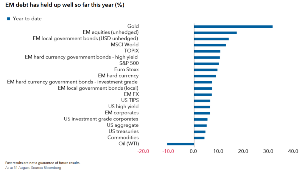 As we enter the final quarter of 2025, emerging market (EM) debt continues to demonstrate resilience against a complex global backdrop. Despite rising policy uncertainty, geopolitical tensions, and evolving trade dynamics, EM debt has largely outperformed other fixed income asset classes so far this year.