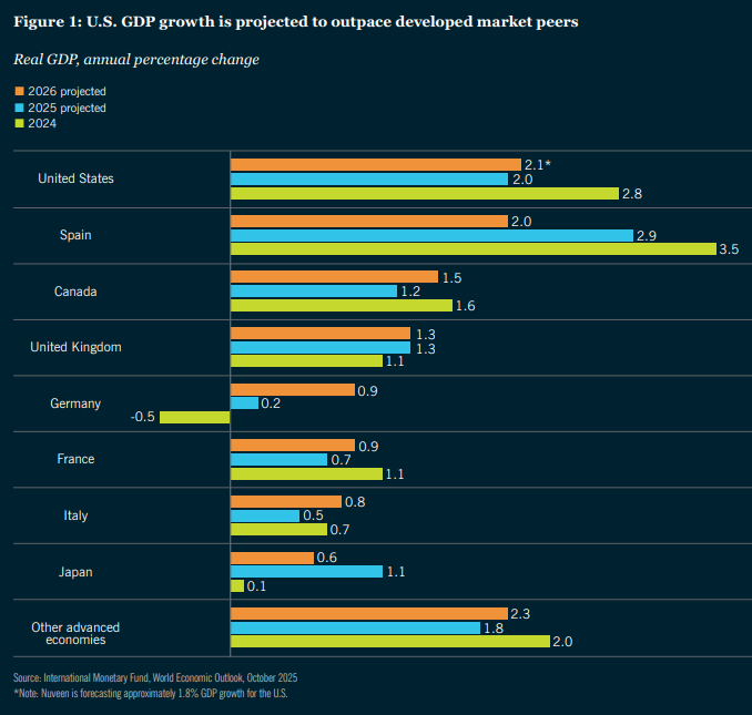 Despite prolonged uncertainty running through the country, the U.S. economy has demonstrated its ability to withstand shocks and beat pessimistic forecasts. Recent fears of recession have given way to tangible optimism. U.S. GDP growth for 2026 is projected to outpace developed market peers, trailing only China globally (Figure 1). Corporate earnings remain robust, and default rates for U.S. credit, especially among higher-rated borrowers, remain overwhelmingly stable. The U.S. dollar, although volatile, continues to anchor international portfolios, providing depth and liquidity that few global markets can match.