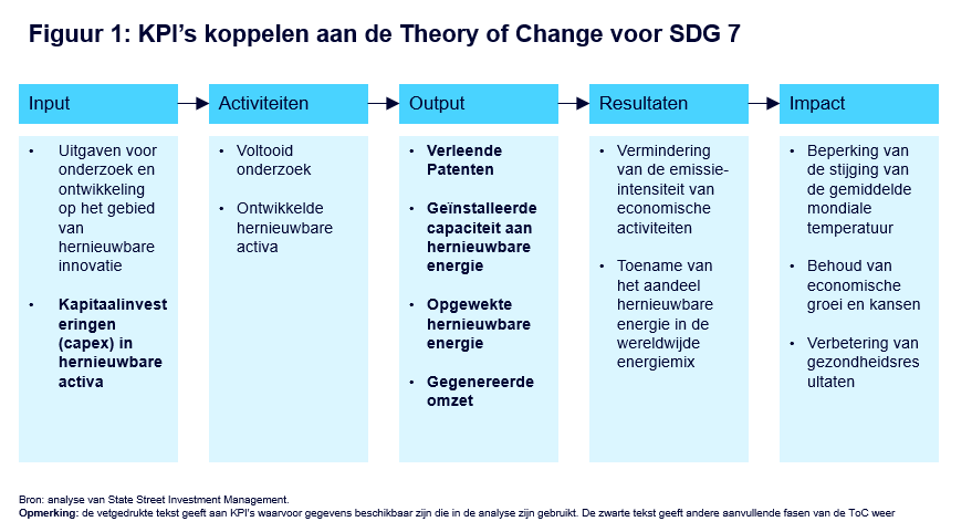 Een derde begrip dat ten grondslag ligt aan het kader is afstemming op de SDG’s van de VN. Daarbij worden KPI’s die worden gebruikt om de bijdrage van activa te bepalen, gekoppeld aan de SDG’s en hun onderliggende doelstellingen. Binnen dit kader is elke KPI op duurzame resultaten afgestemd en elk criterium dat activiteiten identificeert die deze resultaten kunnen ondermijnen, wordt aan de hand van een op bewijs gebaseerde benadering gekoppeld aan de SDG’s. De ToC en KPI’s in afbeelding 1 komen bijvoorbeeld overeen met SDG 7: Betaalbare en schone energie. Deze koppeling kan het gebruik van deze KPI’s valideren en de implementatie van gerichte afstemming van SDG’s voor specifieke doelstellingen vergemakkelijken.